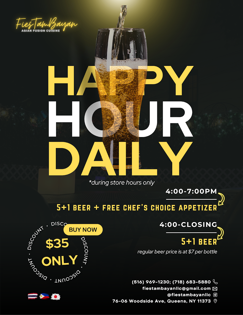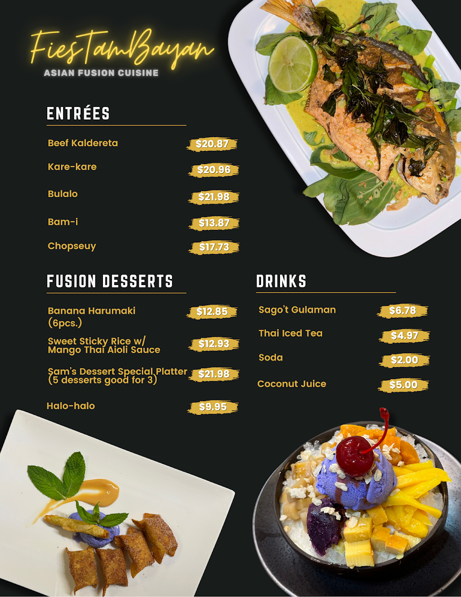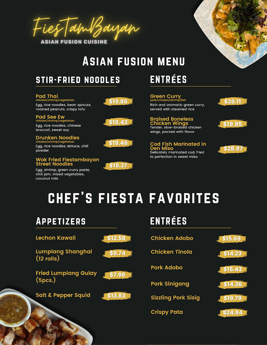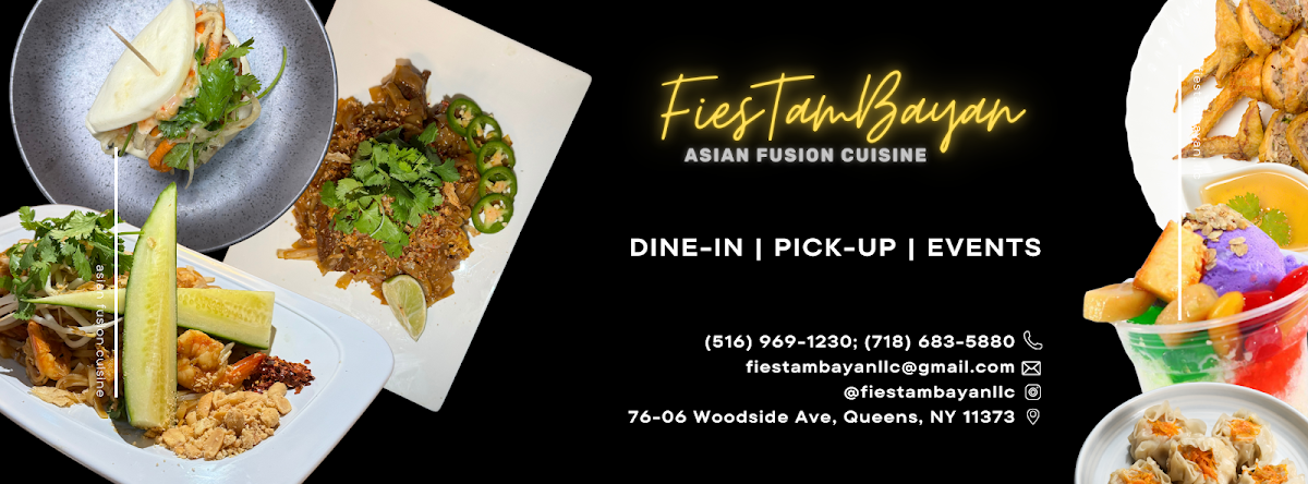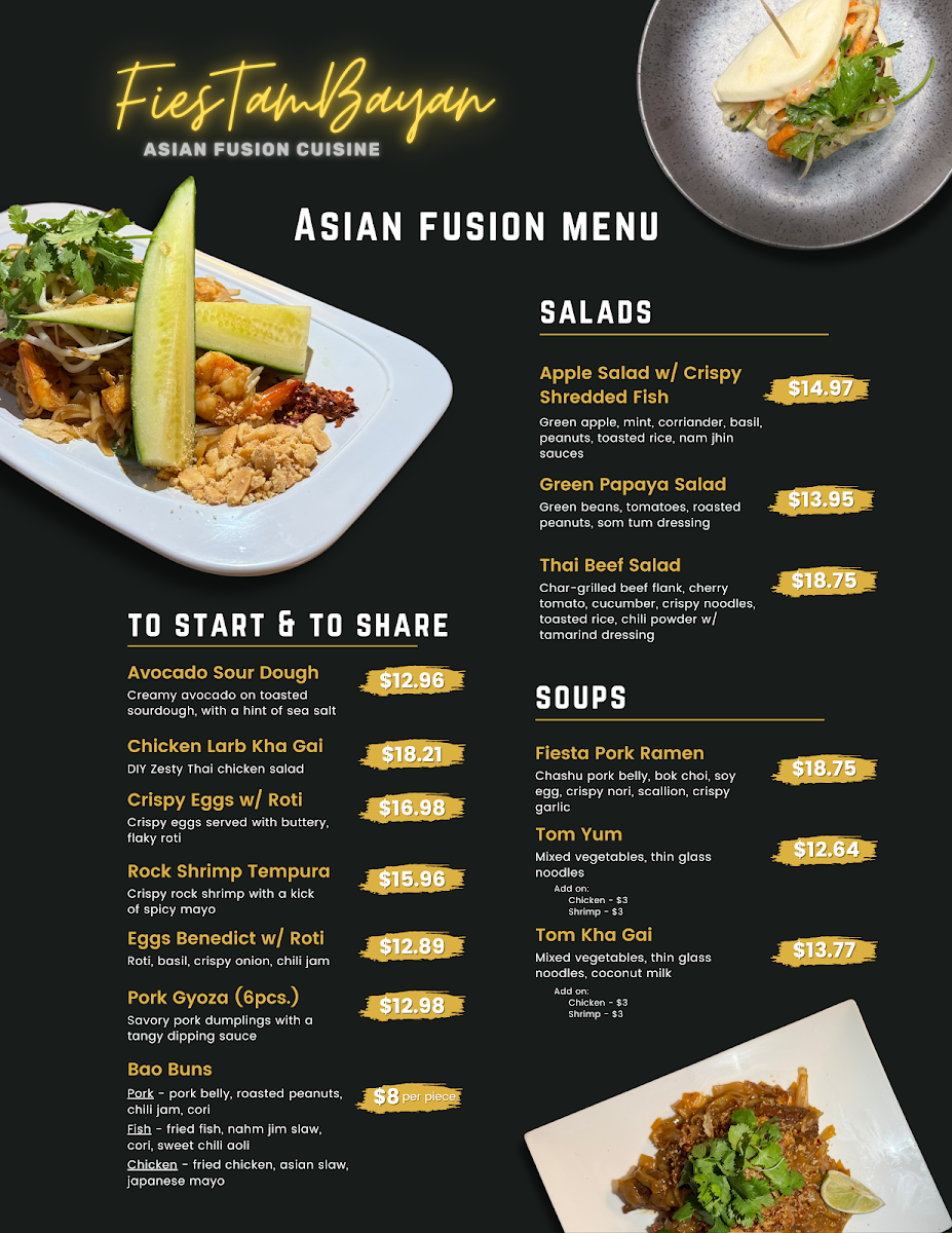 The menu at Fiestambayan LLC offers a delightful mix of flavors, starting with unique appetizers and shareable plates like Chicken Larb Kha Gai, Avocado Sourdough, and Crispy Eggs w/ Roti. For those in the mood for seafood, Rock Shrimp Tempura is a must-try, while Eggs Benedict w/ Roti brings a twist on a classic. The salad section features fresh options such as Apple Salad w/ Crispy Shredded Cheese, Green Papaya Salad, and the savory Thai Beef Salad. If you’re craving soup, the menu has a range of comforting bowls like Fiesta Pork Ramen, Tom Yum, and Tom Kha Gai. For the noodle lovers, the stir-fried noodles are a highlight, with dishes like Pad Thai, Pad See Ew, Drunken Noodles, and the signature Wok Fried Fiestambayan Street Noodles. Each dish offers a perfect balance of textures and vibrant flavors, making Fiestambayan a great place to enjoy authentic, Thai-inspired cuisine.
